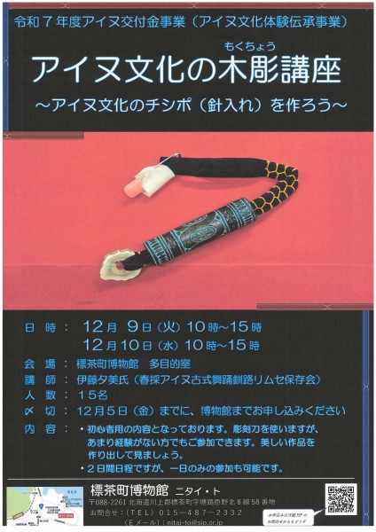 下記日程にて、アイヌ文化体験講座「アイヌ文化の木彫講座〜アイヌ文化のチシポ(針入れ)を作ろう~」を、12月9日~10日の2日間の日程で実施いたします。